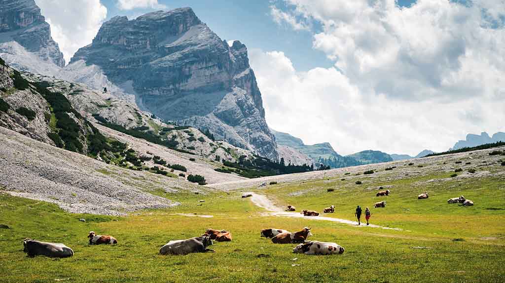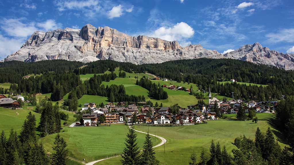 Três horas de estrada desde Veneza bastam para mudar tudo. O asfalto serpenteia florestas, campos floridos e vilarejos encaixados em escarpas calcárias, até que, entre Trento e Bolzano, as Dolomitas se revelam: torres de rocha clara com mais de 3 mil metros de altura, uma luz dourada, girando com o dia, e silhuetas minerais que redesenham o céu. Reconhecida pela Unesco, essa cordilheira dos Alpes italianos abriga vales onde ainda se fala ladino – um idioma ancestral que convive com o italiano e o alemão, num cotidiano trilíngue. O maciço do Sella marca o centro geológico da região e separa os vales de Gardena, Fassa e Badia. Alta Badia ocupa esse último, com uma rede de vilarejos ligados por gôndolas, trilhas e refúgios de altitude. Aqui o bem-estar dita o ritmo.