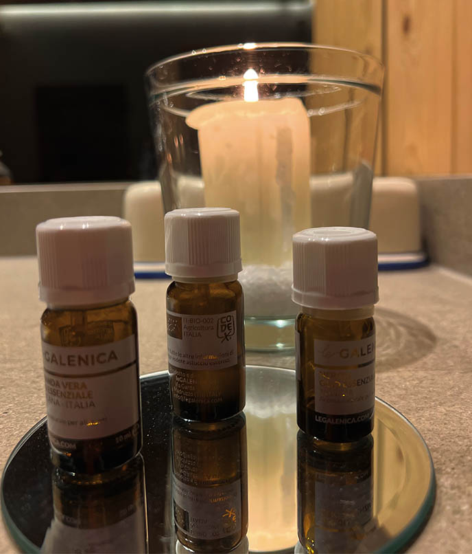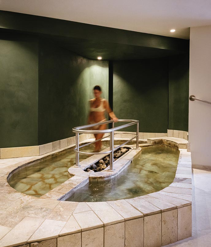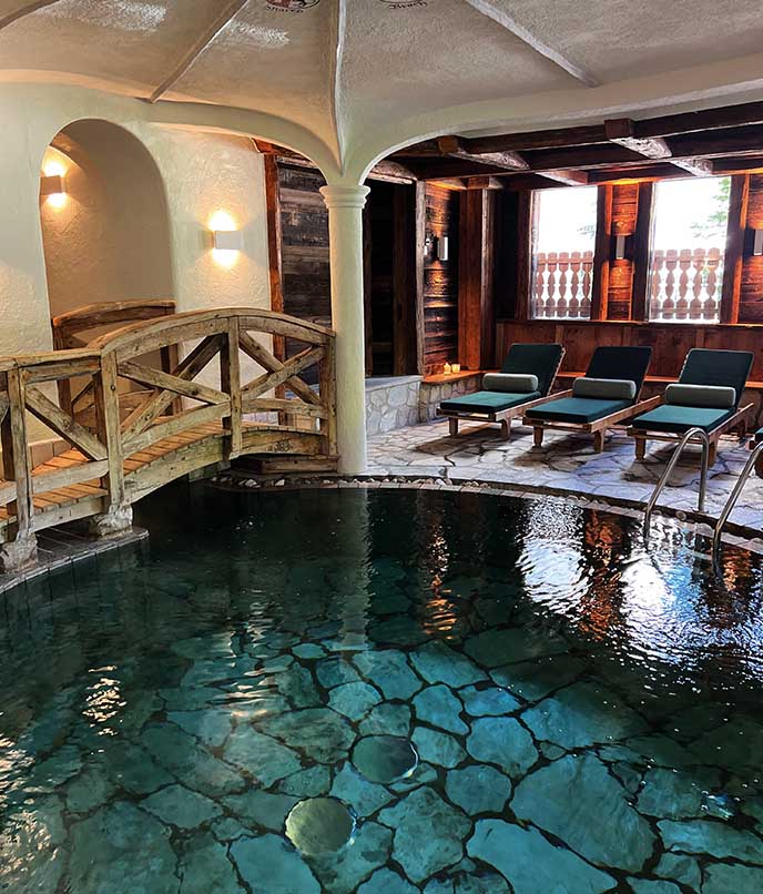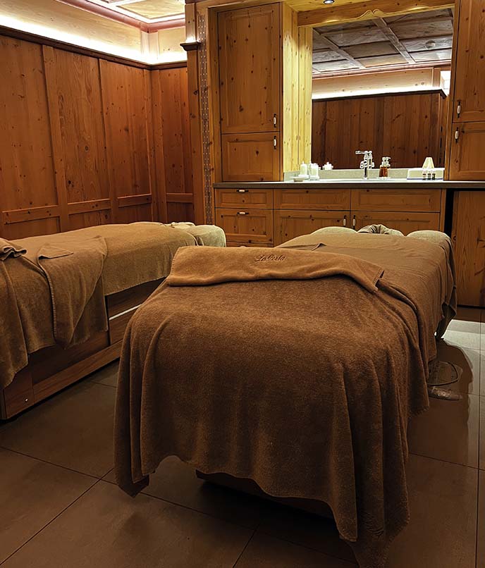 O spa é um mundo à parte. A piscina aquecida, com jatos submersos, temperatura de 30 °C, borda orgânica e ponte de madeira, se abre para o vale e reflete o Sassongher em suas janelas amplas. A forma sinuosa evoca um lago alpino, com profundidade gradual e áreas de descanso aquático. O percurso térmico inclui o Kneipp Path, uma bio sauna de pinho-silvestre com aroma de feno seco, sauna seca a 90 °C, hammam com óleos essenciais e sala de gelo com neve moída e duchas de eucalipto. A stube de relaxamento tem janelas voltadas para o vale. Cada cabine foi construída com uma madeira diferente, levando em conta suas propriedades terapêuticas. Os protocolos, assinados pela experiente spa manager Anna Fusari, visam o relaxamento, a recuperação e um reset total. A Sassongher Massage atua na fáscia muscular, com alongamentos passivos, pressão profunda e óleo de arnica – ideal após trilhas, pedaladas ou esqui. A Sensory Path combina esfoliação, drenagem facial e produtos botânicos alpinos da Legal Enica, ajustados ao estado físico e emocional de cada hóspede. As terapeutas são altamente treinadas, e a atmosfera, de pura indulgência e bem-estar natural.