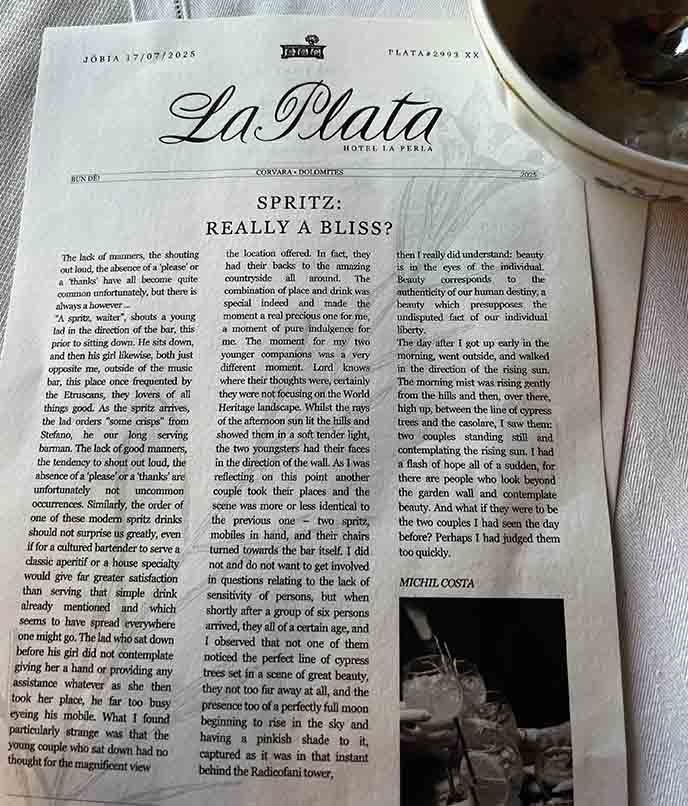 Corvara, um vilarejo cercado pelo Parque Natural Puez-Odle e dominado pelo Sassongher (de 2.665 m), é o coração de Alta Badia – e endereço do encantador Hotel La Perla, conduzido com alma pela família Costa desde 1956. A gentil equipe – atenciosa, elegante, de vestidos bordados, aventais de linho e coletes alpinos – chama pelo nome, sorri com os olhos e antecipa os gestos. No café da manhã, uma gazette impressa traz informações sobre o clima e notícias da região. Os cinco restaurantes se espalham pelo chalé, entre salas com livros, flores, madeiras antigas e objetos regionais. Há um spa com vista para as montanhas e uma adega com mais de 30 mil garrafas. No jardim ao lado da igrejinha, hortas, uma casa na árvore e uma birreria, no antigo estábulo, compõem a cena. As suítes têm madeira clara, tecidos naturais, piso aquecido e amenities botânicas, com janelas e varandas voltadas para a paisagem. O Dolomiti Express, o ônibus vintage do hotel, cruza a vila devagar. O La Perla integra a Leading Hotels of the World e combina alta hospitalidade com cultura ladina e requinte nos detalhes. A Costa Family Foundation promove ações ligadas à cultura local e à Economia do Bem Comum, um movimento europeu baseado em vínculos éticos e sustentáveis.