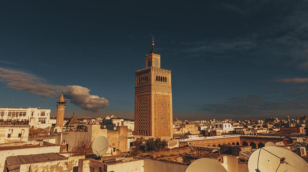 Vista da Medina de Túnis com o minarete da Mesquita Al Zaytuna, fundada em 864, ao fundo