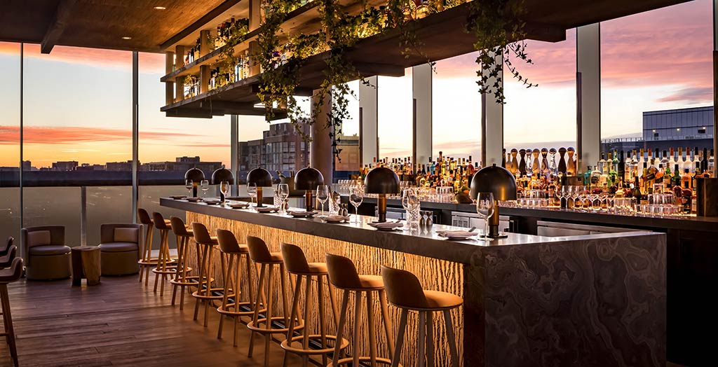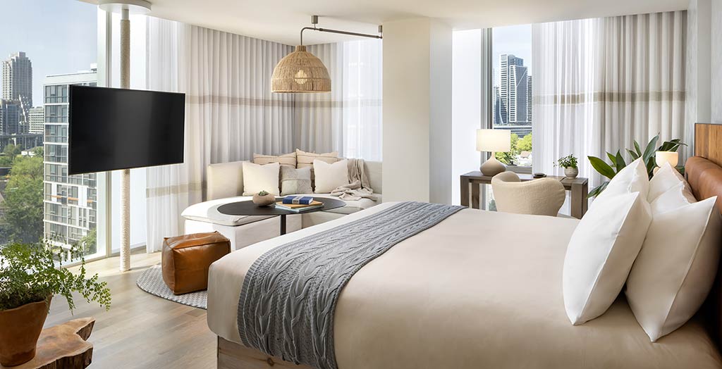 Nos 112 quartos e 21 suítes com vistas da cidade e do horizonte, os hóspedes encontram comodidades como plantas, lençóis de algodão orgânico, tapetes de ioga e cosméticos orgânicos. Além disso, os quartos possuem um sistema de filtragem de água, com copos e garrafas feitas de garrafas de vinhos recuperadas, eliminando, assim, o uso de plástico único.