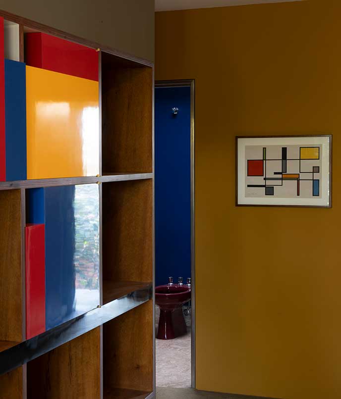 Líder do movimento nomeado de Escola Paulista ou Brutalismo Paulista, Artigas foi também o autor do prédio da Faculdade de Arquitetura e Urbanismo (FAU-USP), um de seus trabalhos mais célebres. Na residência do Alto da Boa Vista, o arquiteto empregou características que marcaram a sua obra, como o espaço amplo (quase 700 metros), a disposição dos cômodos voltada para o interior do imóvel, criando uma atmosfera mais íntima, e o uso bastante livre e ousado da cor – o que se vê logo à entrada, no vitral assinado por ele. A configuração da casa se mostrou ideal à exposição da ABERTO, graças aos espaços generosos organizados em diferentes patamares e interconectados por recortes que permitem entrever os volumes.