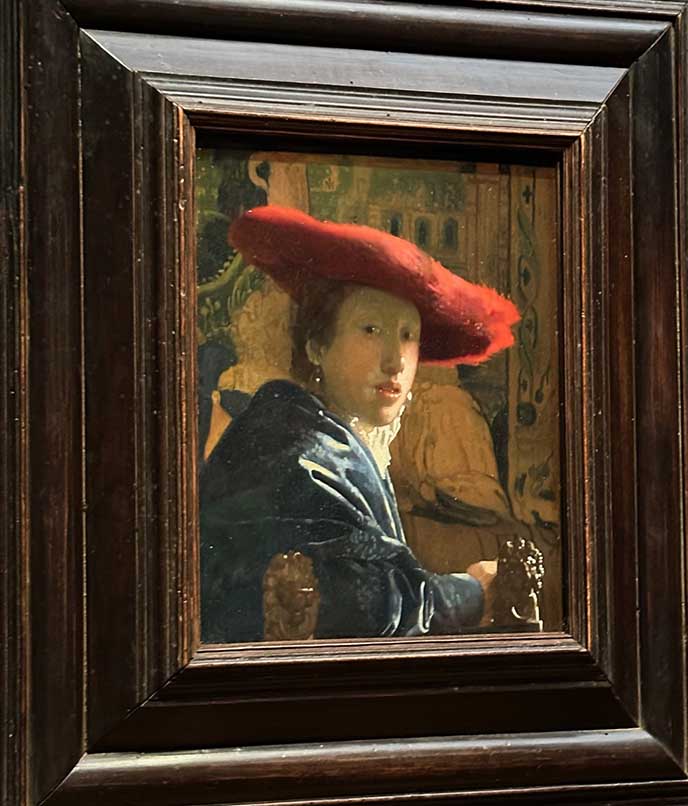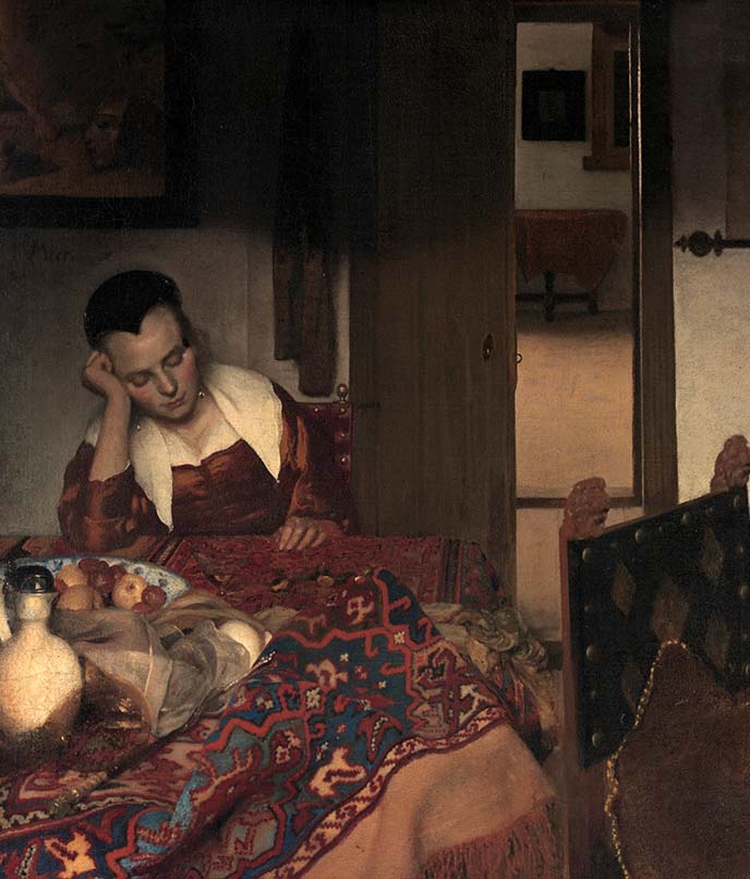Em “A Criada Adormecida”, emprestada pelo Metropolitan de Nova York, a luz adentra a casa por uma fresta direta, fora da convencional diagonal esquerda da maioria de seus quadros. Já na pequena “Garota com Chapéu Vermelho”, do National Gallery of Art, de Washington, testemunhamos a versatilidade de sua técnica, com a luz entrando pela direita.