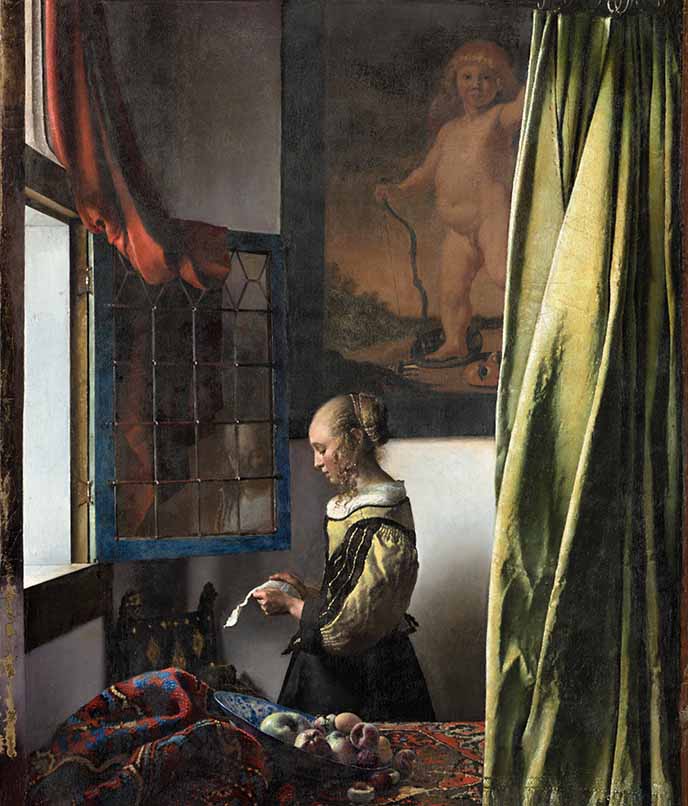 “A Garota Lendo uma Carta com a Janela Aberta”, da Gemaldegalerie de Dresden, obra recém-restaurada, apresentada ao grande público pela primeira vez, revela um cupido triunfante no quadro de fundo da cena, dando ao conjunto a sensação de seis dimensões. O mesmo cupido aparece em outros dois quadros, nunca da mesma forma.