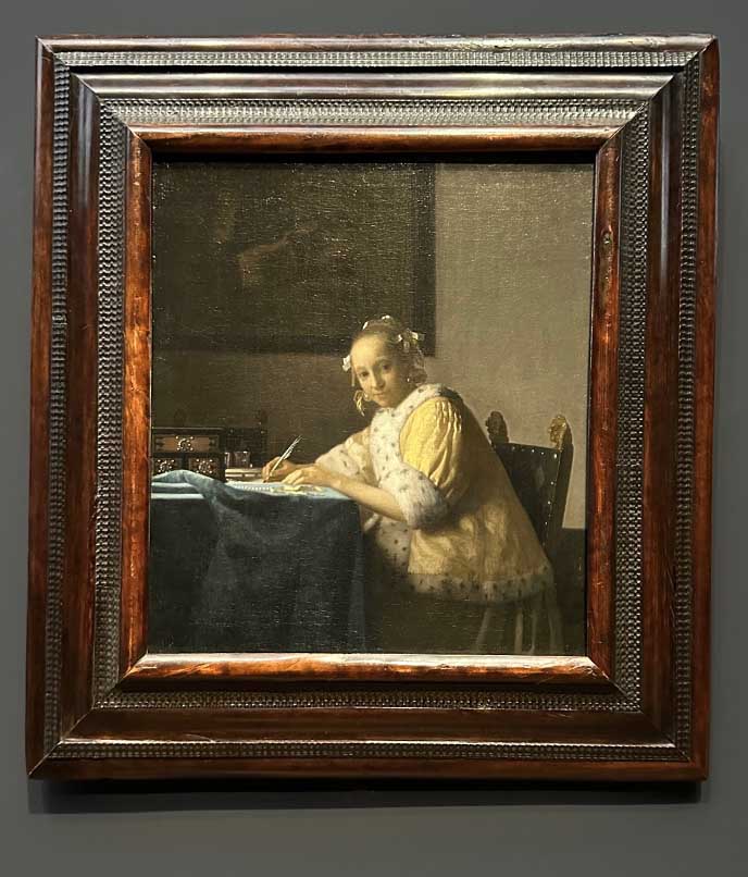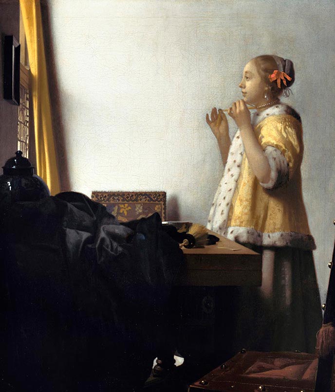 Em a “Mulher com Colar de Pérolas”, da Gemaldegalerie de Berlim, o reflexo da luz em um colar minúsculo parece ter sido feito com apenas uma ou duas pinceladas virtuosas. Pela primeira vez, ela está exposta lado a lado com “Jovem Mulher com Alaúde”, do Met; A “Carta de Amor”, do Rijksmuseum; “Uma Senhora Escrevendo”, da National Gallery of Art, de Washington. Em comum todas utilizam um casaco amarelo com pele branca, que se ilumina de acordo com a entrada do sol de Delft