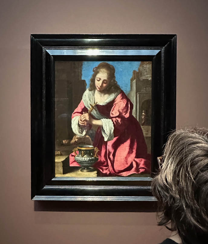 Mas de todos os quadros que viajaram para Amsterdã, um que vi há muitos anos, na primeira viagem a Nova York, me fez atrapalhar um pouquinho o trânsito dos visitantes na estreia da exposição. A personagem de “A Alegoria da Fé Católica”, do Met, representa a igreja, com o pé acima do mundo. Ela repousa em uma mesa com crucifixo, bíblia e cálice, fazendo alusão ao momento em que a fé católica foi banida dos Países Baixos. Depois de alguns anos apresentando igrejas secretas e explicando para visitantes que a liberdade que experimentamos nos Países Baixos nasceu da tolerância religiosa, este quadro, hoje, me emociona ainda mais.