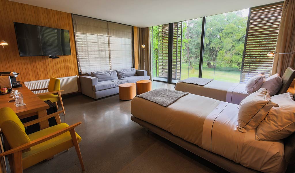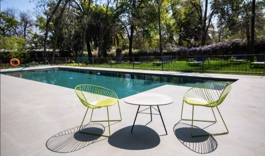 Num parque de oito hectares, pontilhado por árvores nativas, o Las Majadas é composto por dois prédios: um charmoso palácio renascentista francês centenário projetado pelo arquiteto Alberto Cruz Montt; e um edifício moderno e minimalista assinado pelo escritório de arquitetura Lyon-Bosch, onde encontram-se as 50 acomodações. Se o primeiro exalta chame, o segundo encanta com seu formato sinuoso e pelo uso de materiais como madeira talhada, cimento queimado, madeiras nobres caídas do bosque e muito vidro, que propicia a abundância de luz natural.