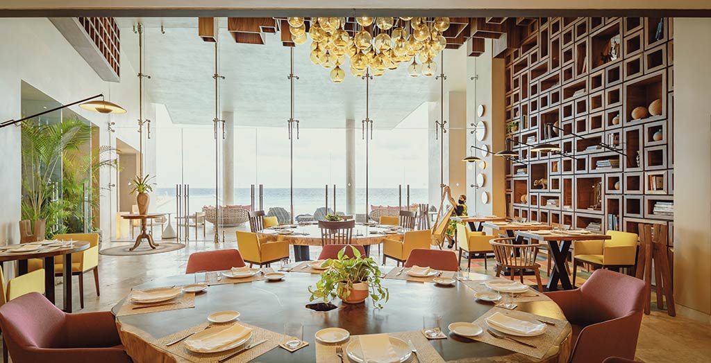 Outros destaques do resort são a chocolateria, a adega, a biblioteca, a loja conceito com arte e tecidos mexicanos escolhidos pela estilista Carla Fernández, e a piscina de borda infinita – com 40 metros projetados sobre o mar.
