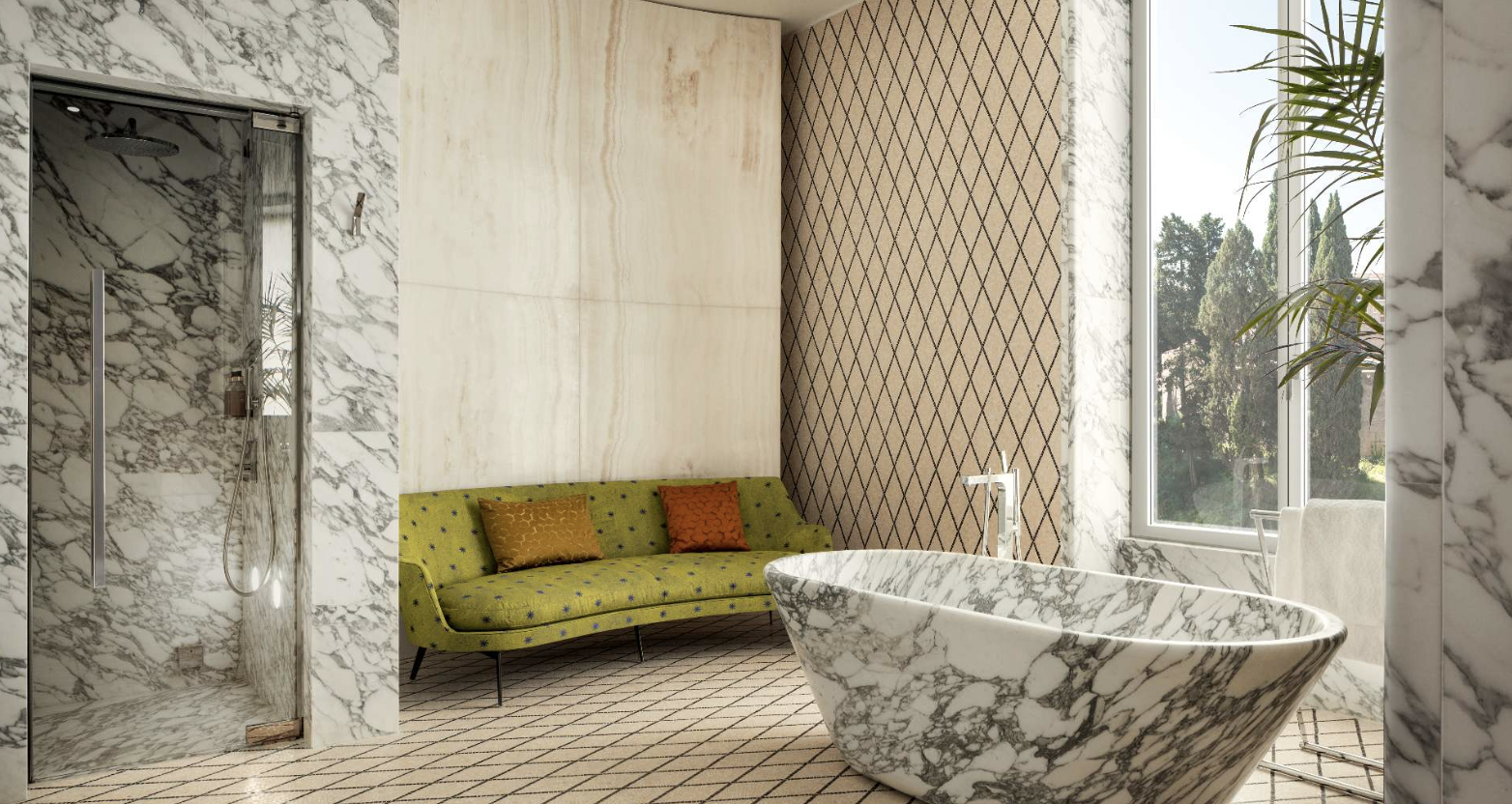 Com 114 quartos, o Bulgari Hotel Roma presta homenagem à paixão do imperador Augusto pelo mármore e capta a linguagem cheia de cores da marca Bulgari. Os banheiros do hotel são desenhados por meio de uma paleta de mármore colorido, definindo assim o tom que flui para o mobiliário do quarto.