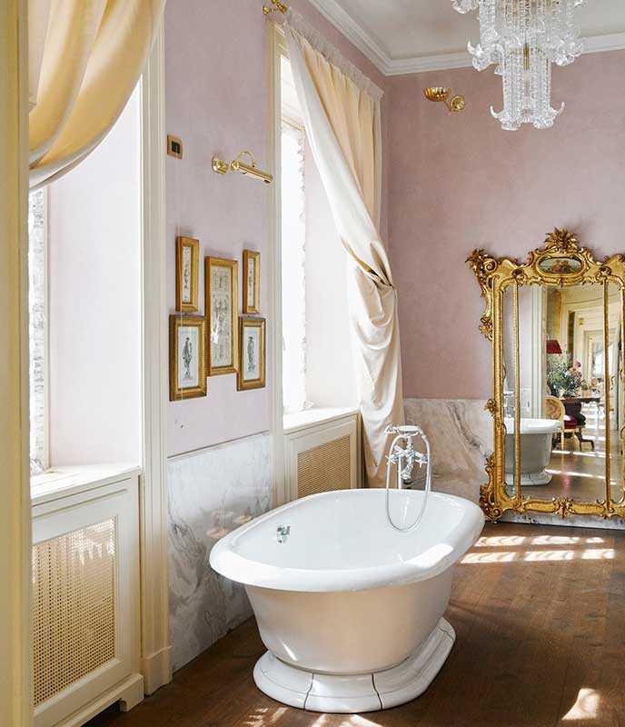 Os ambientes têm entre os detalhes lustres de vidro de Murano, afrescos resplandecentes e grandes escadas. Paredes, pisos e superfícies mostram antiguidades, pinturas e tapetes selecionados criteriosamente.