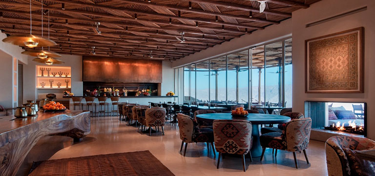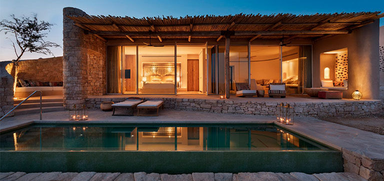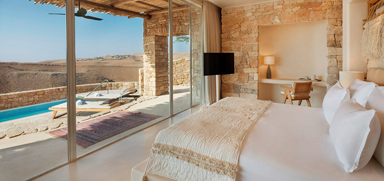 O projeto do Six Senses integra-se perfeitamente à paisagem, exibindo uma reinterpretação moderna das estruturas nômades dos nabateus. São 60 suítes e vilas feitas com pedra natural, madeira, cobre e teca recuperada, com vistas de 360º do entorno. O design é inspirado em padrões e texturas que remetem à antiga Rota do Incenso.