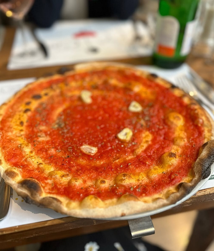 É a protagonista da cena romana, conhecida pela massa fina e crocante (“scrocchiarella”) do centro às extremidades. A borda, aliás, não se assemelha à da napolitana (o chamado corniccione, alto, macio e aerado). A graça da tonda romana está na leveza. A massa é aberta em espessura bem fina (vários lugares fazem isso com rolo) e assada para ficar dourada e estaladiça, entregando um “scroc” limpo a cada mordida. Menos ‘carvão’ na borda, mais estalo constante. É uma pizza que some do prato sem pesar no estômago, perfeita para acompanhar uma birra (cerveja) e seguir a noite.