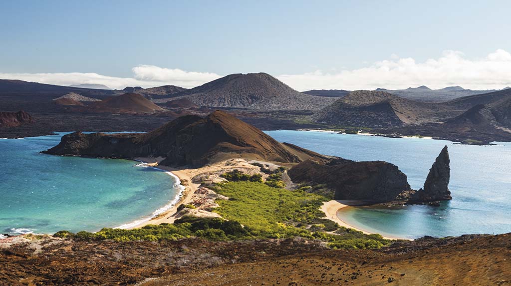 Vista sobre a ilha vulcânica de Bartolomé, um dos destaques no roteiro por Galápagos | Foto: Getty