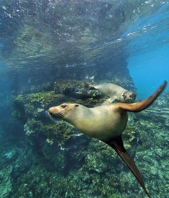 O ecossistema de Galápagos é tão sintonizado que, em um mesmo mergulho, é possível cruzar com um tubarão‑de‑pontas‑brancas‑de‑recife, acompanhar uma tartaruga marinha, flutuar com uma raia, interagir com cardumes, flagrar um cormorão caçando e brincar com os leões‑marinhos. Esses últimos estão por toda parte, cheios de audácia e curiosidade sobre a espécie invasora — no caso, eu, humana.